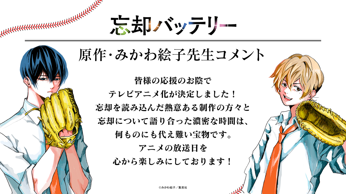 漫画『忘却バッテリー』の著者であるみかわ絵子先生からコメントが到着しました。